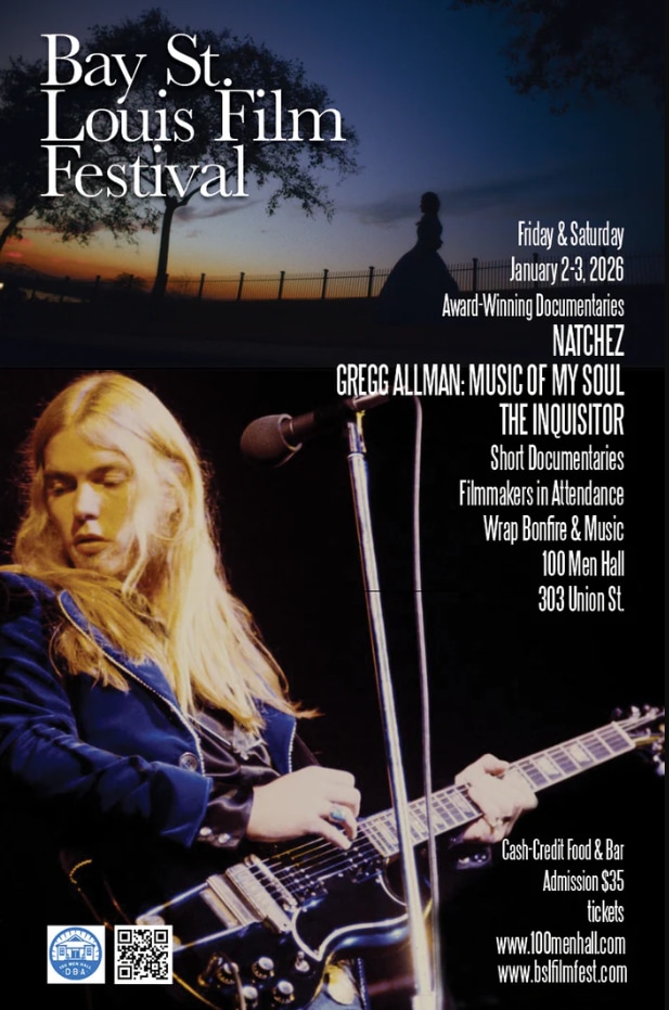 The power-house documentaries: NATCHEZ, THE INQUISITOR and GREGG ALLMAN: MUSIC OF MY SOUL headline the 2026 edition of the Bay St. Louis Film Festival, January 2-3 at the legendary 100 Men Hall. Tickets for both days is $35 available online or at the door at www.100menhall.com