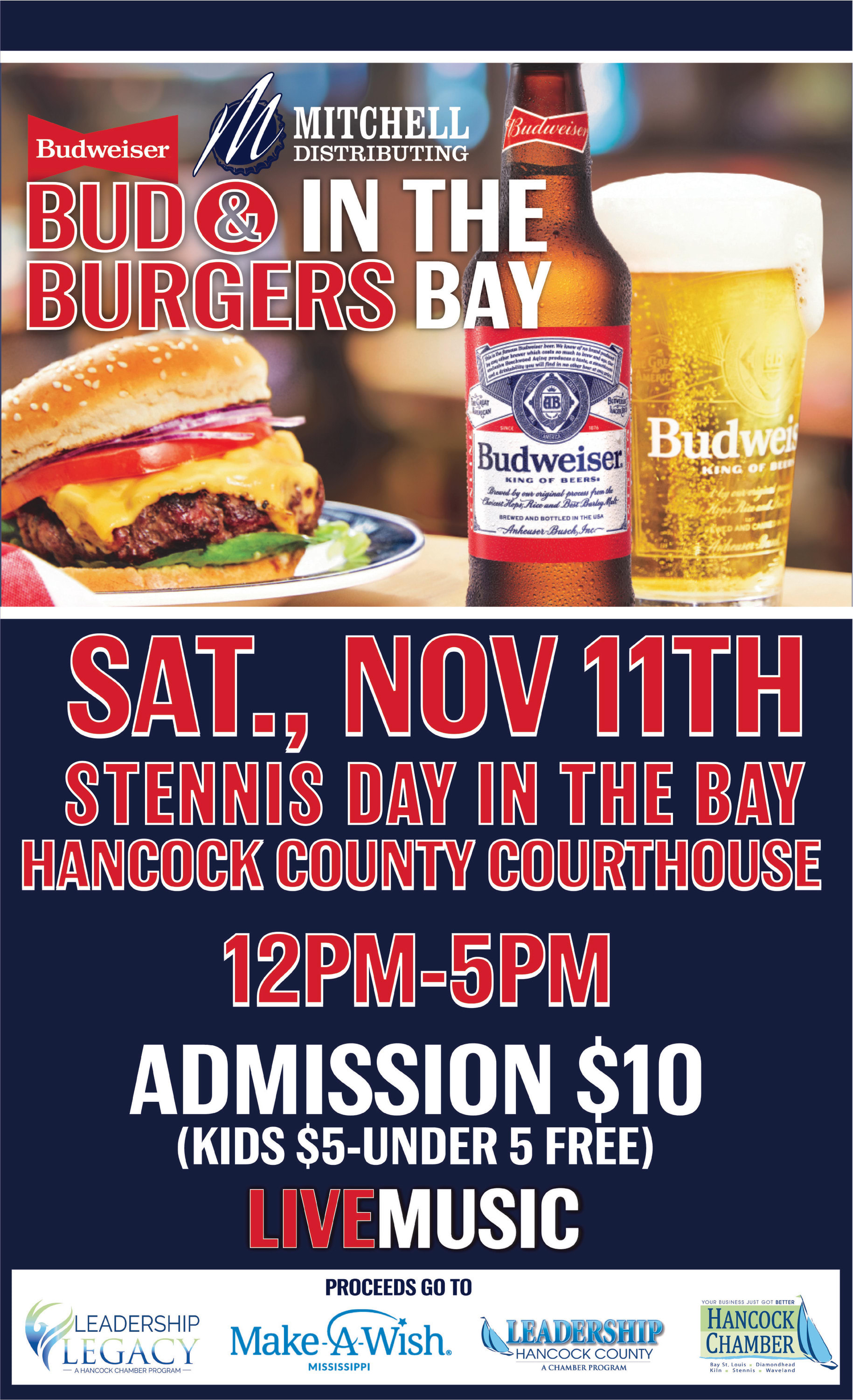 GET READY FOR A SIZZLING AND OUT OF THIS WORLD EVENT IN THE BAY! We're excited to invite you to Bud & Burgers in the Bay, a one-of-a-kind competition that's all about finding the best burger in the region. This spectacular event is set to take place during Stennis Day on Saturday, November 11th, from 12 noon to 5 pm at the Historic Courthouse on Main Street.