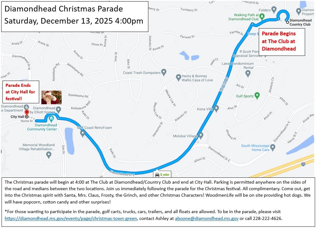 If you'd like to be in the parade with a golf cart, truck or float, please email aboone@diamondhead.ms.gov.