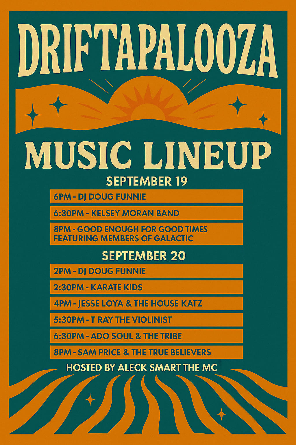 The lineup includes: DJ Doug Funnie, Kelsey Moran Band, Good Enough For Good Times (featuring members of Galactic), Karate Kids, Jesse Loya & The House Katz, T Ray the Violinist, Ado Soul & The Tribe, and Sam Price & The True Believers.