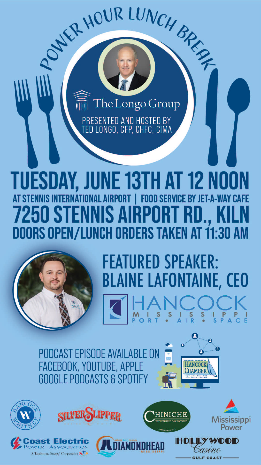 Join the Hancock Chamber for Power Hour Lunch Break! This month our host Ted Longo will interview Hancock County Port & Harbor Commission CEO, Blaine LaFontaine. There is no registration fee to attend, but everyone covers the cost of their own lunch. We recommend arriving around 11:30 to place an order at the counter at Jet-A-Way Cafe. The presentation will take place in the conference room on the 2nd floor. We are requesting that everyone register so that we can give our hosts an accurate headcount so they can be prepared for our arrival.