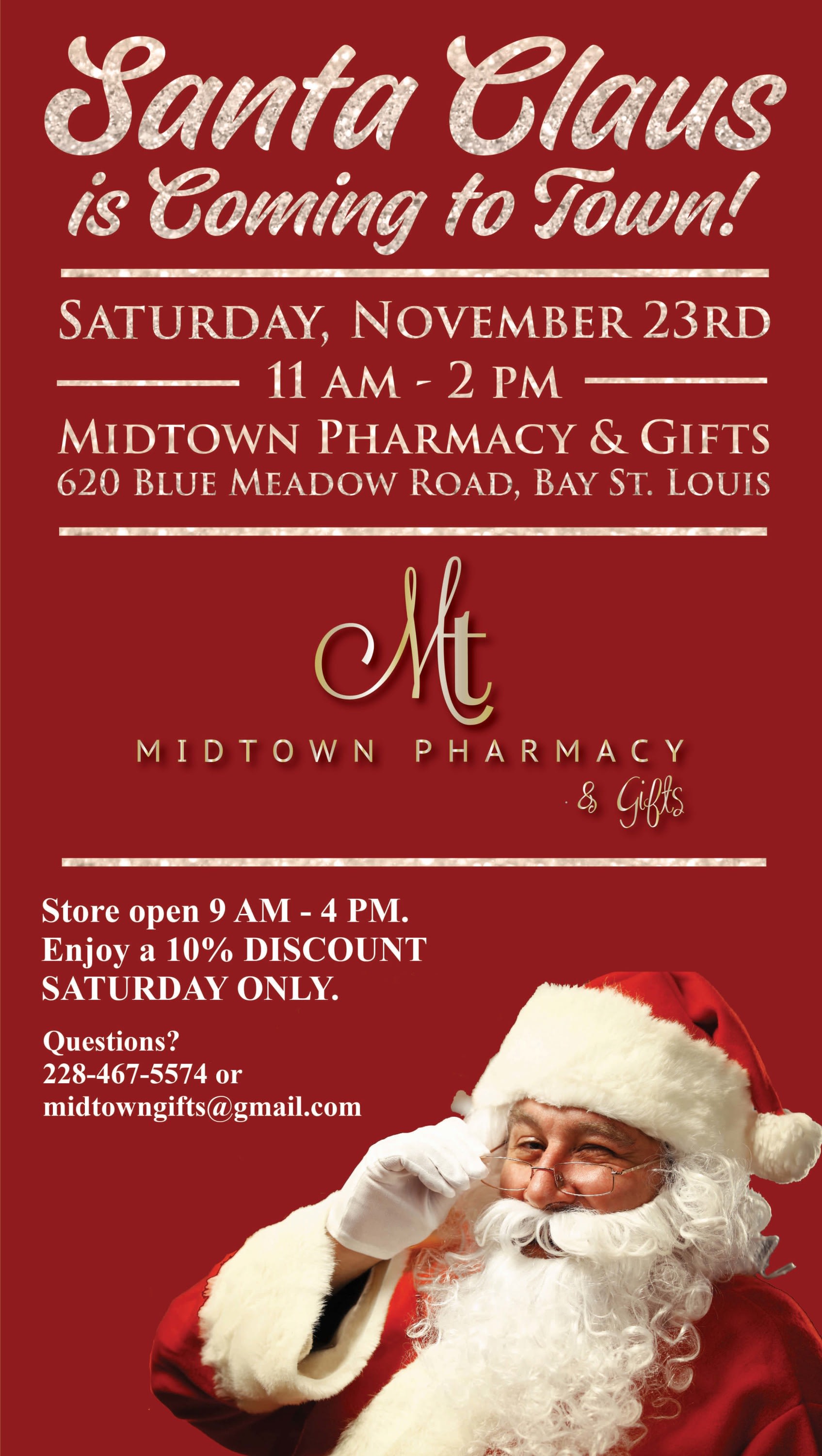 Santa is coming to town! Bring your children to take a picture and go over their Christmas lists on Saturday, Nov. 23rd from 11 a.m. - 2 p.m. Midtown Pharmacy will have extended hours for you to start your holiday shopping! Visit from 9 a.m. - 4 p.m. and enjoy a special 10% discount. Discount available Saturday only.