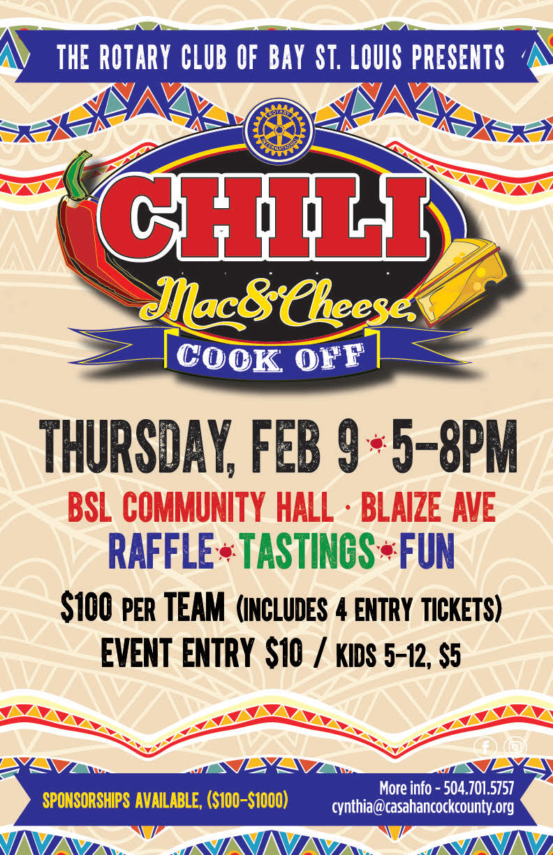 Chili Mac N Cheese tickets can be purchased through any Rotarian or they can be purchased at the door. Beer, wine, soft drinks, and water will available be for sale. There will also be a 50/50 raffle and awards will be given out in the end.